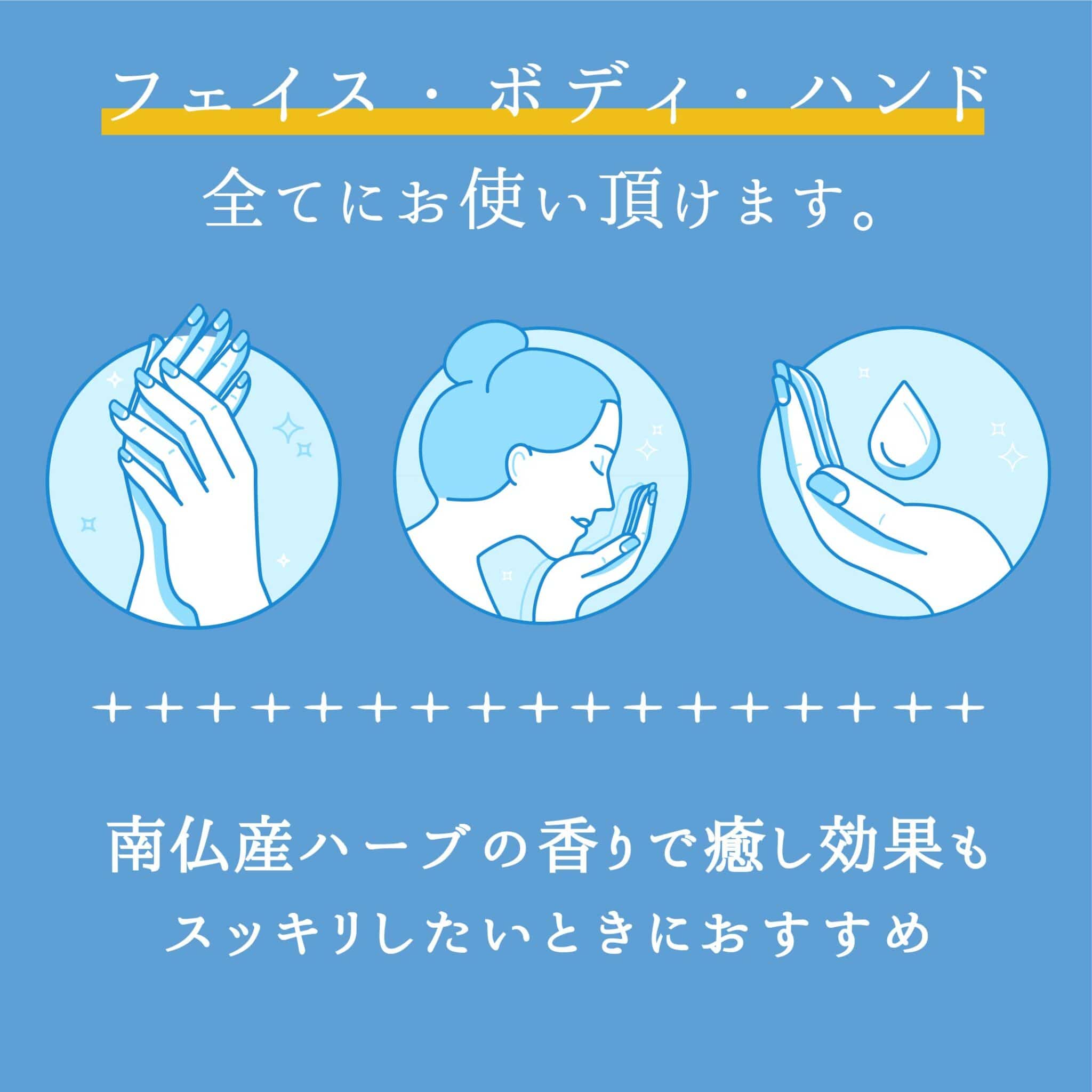全成分表示: オリーブ脂肪酸Na*、ヤシ脂肪酸Na*、コメヌカ油脂肪酸Na、ヒマシ脂肪酸Na、グリセリン、水、ウインターセボリー油、ローズマリー葉油、カオリン、リナロール**、リモネン**、ゲラニオール**【 **=精油中に含まれる成分 / ***=自社農園で収穫される植物成分】